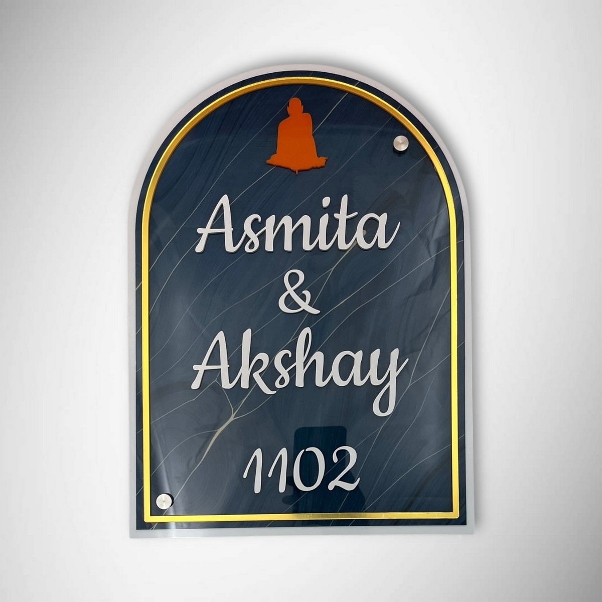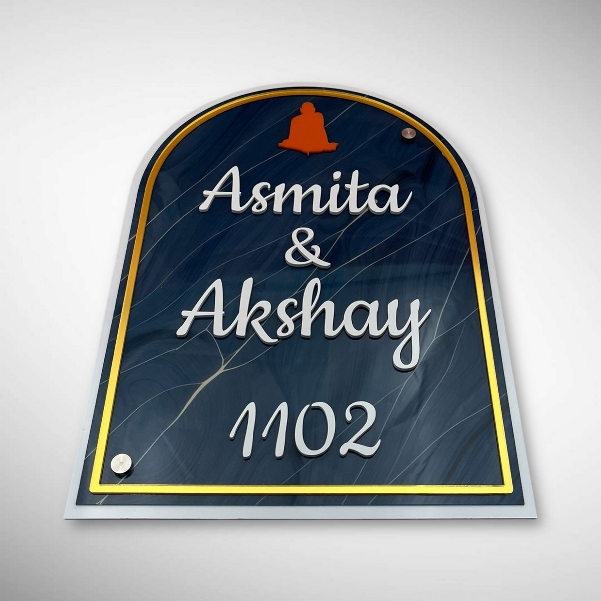 Enhance your home’s entrance with this ACP-based blue acrylic nameplate. Featuring UV printed textured letters, it’s personalized for Asmita & Akshay and built to last. Ideal for modern homes, offices, or gifting, this nameplate makes a stylish statement.