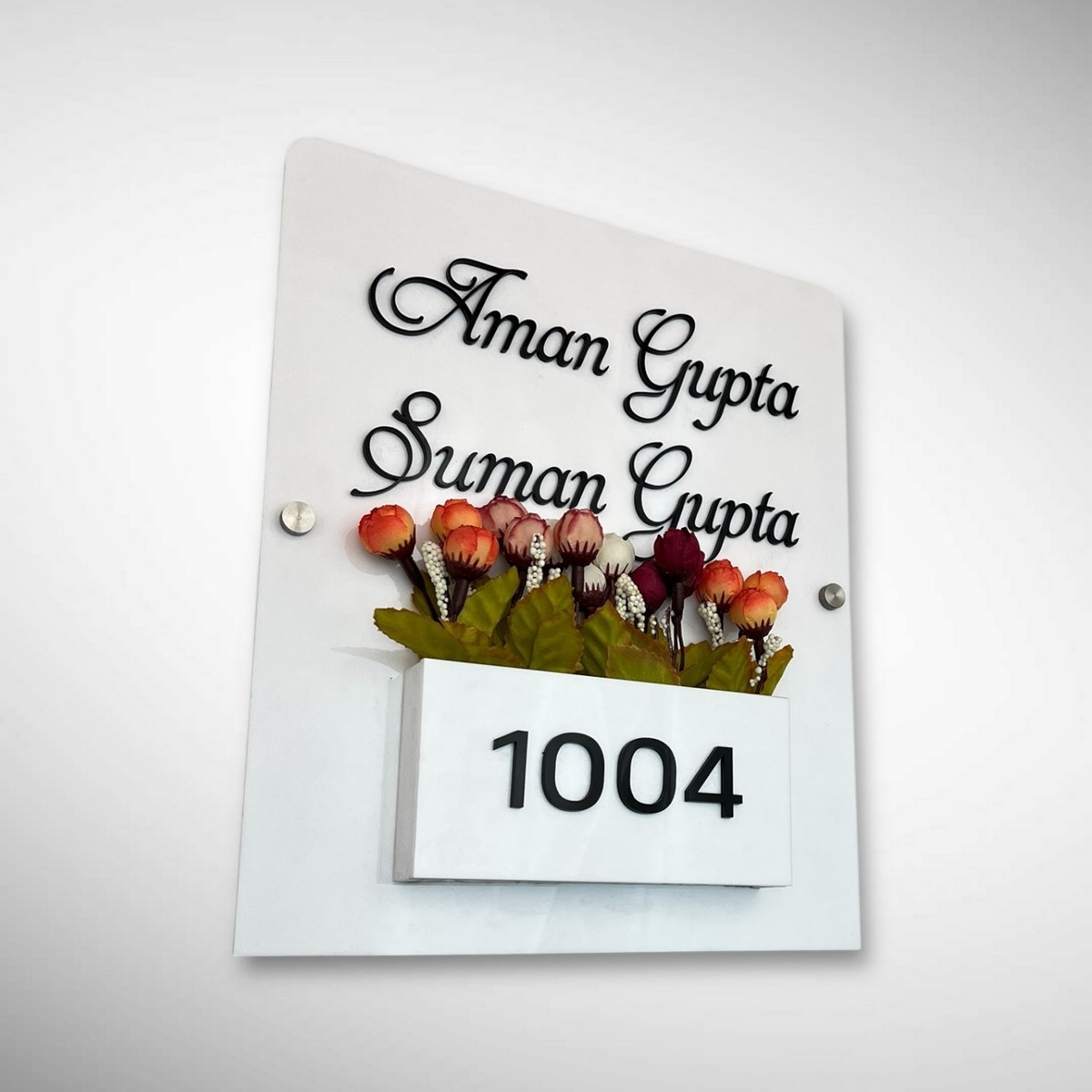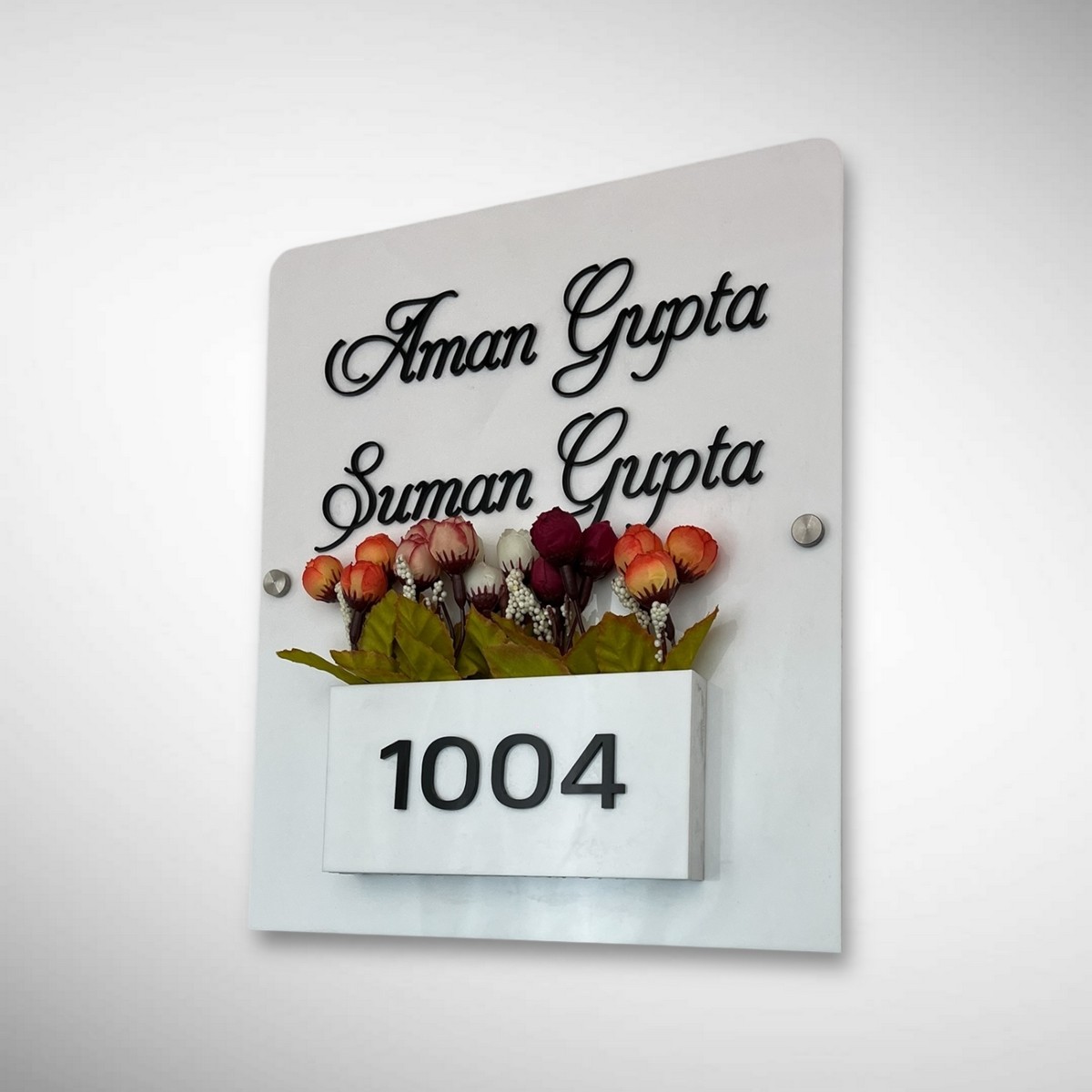 Add a modern and refreshing look to your entrance with a custom white acrylic planter nameplate. Designed for durability and elegance, this nameplate features a clean white acrylic finish combined with a planter holder that enhances your home décor naturally.