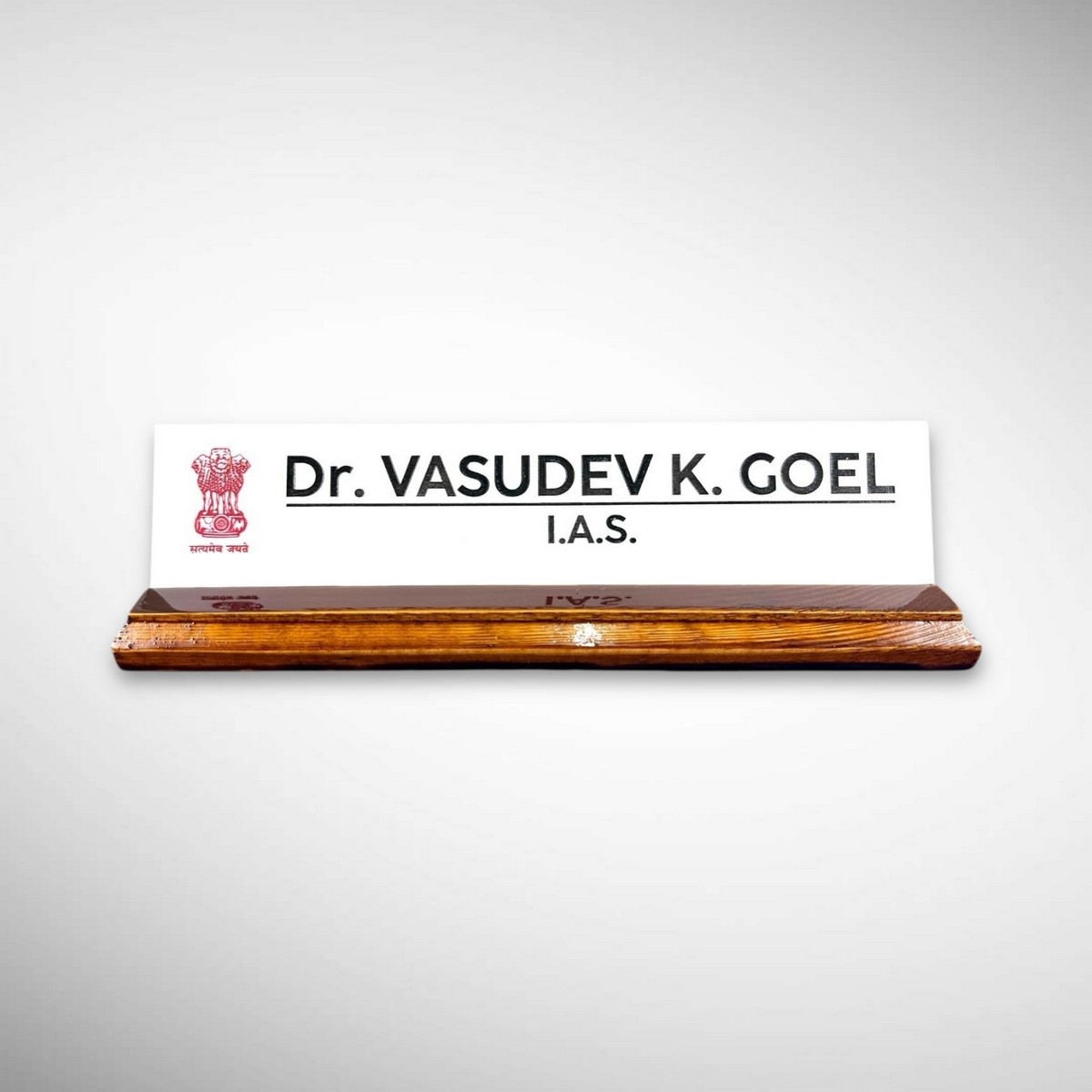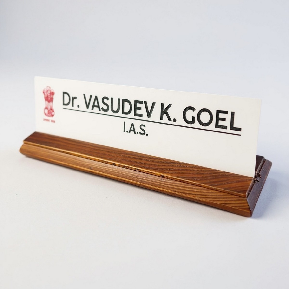 This doctor desk nameplate features a polished wooden base with a sleek acrylic name panel, offering a professional and elegant look for clinics and offices.