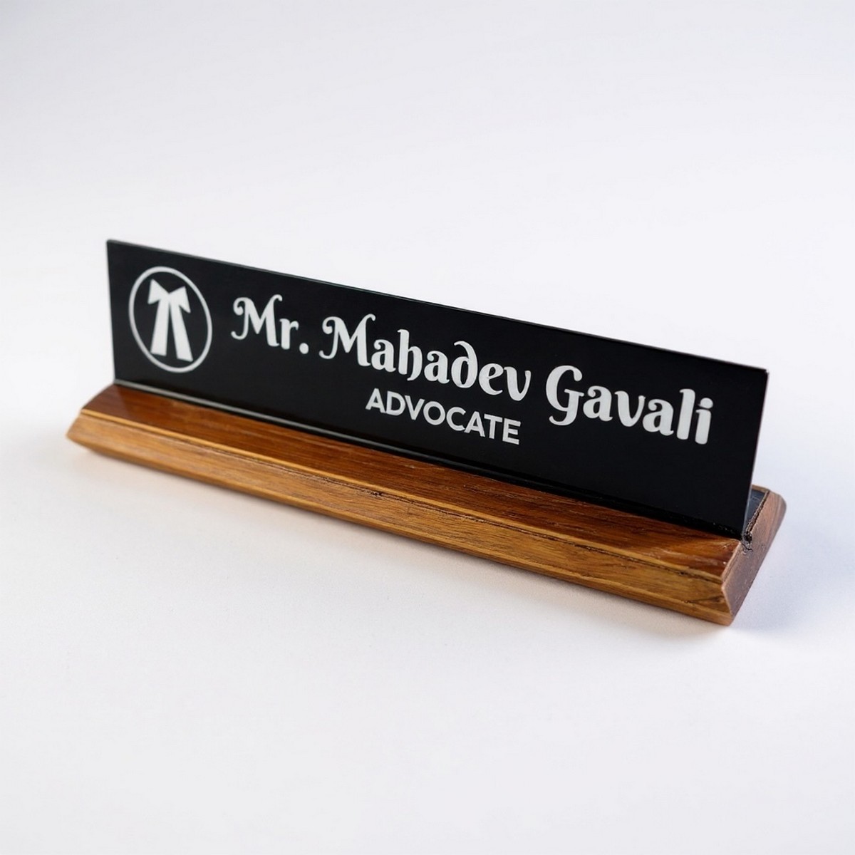 This personalized desk nameplate features a high-quality wooden base with sleek acrylic lettering, making it ideal for advocates and corporate professionals.
