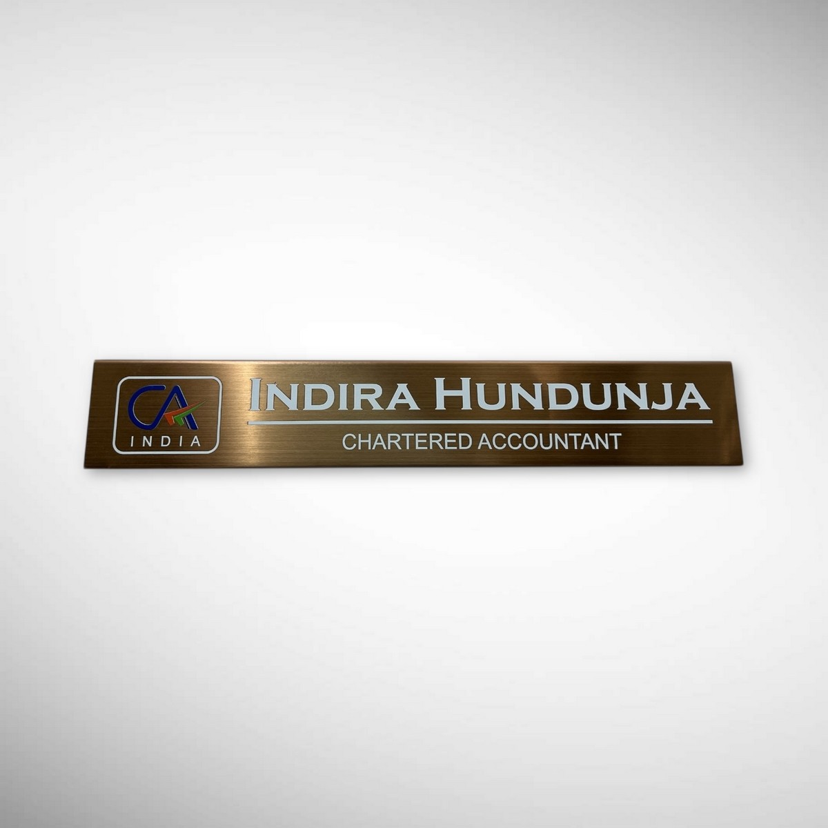 Make a bold professional statement with this luxurious brushed metal desk nameplate, personalised with the name Indira Hundunja. Crafted for modern leaders, this nameplate blends elegance, durability, and timeless style.
