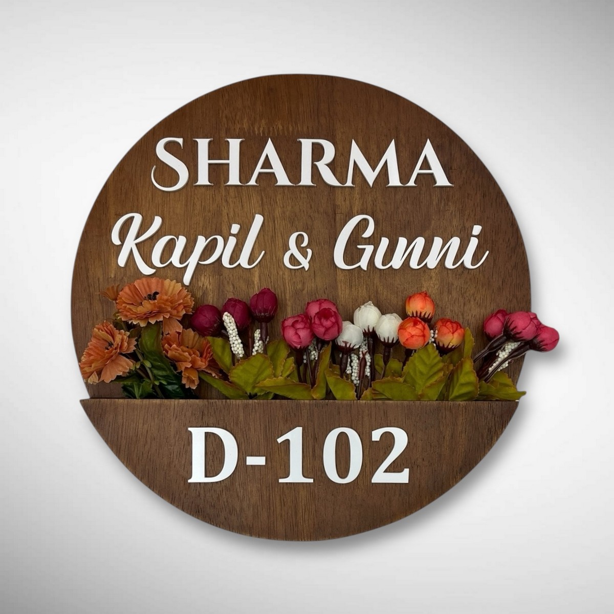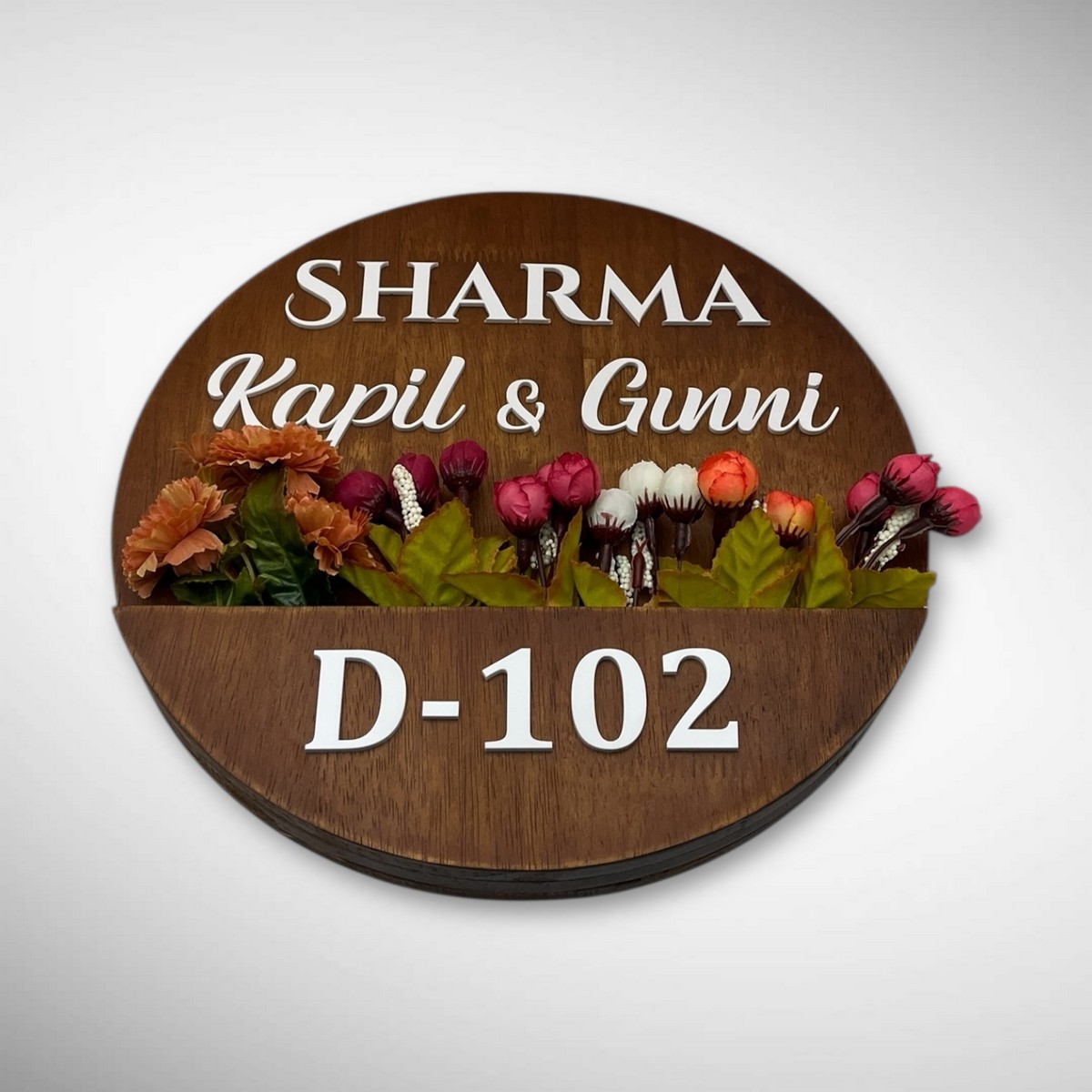 This Round Shape Rubber Wood Brown Polish Planter Nameplate is designed for families who want a stylish and durable nameplate for their home entrance. Made from high-quality rubber wood, it features a smooth brown polish and a unique planter-inspired round design.