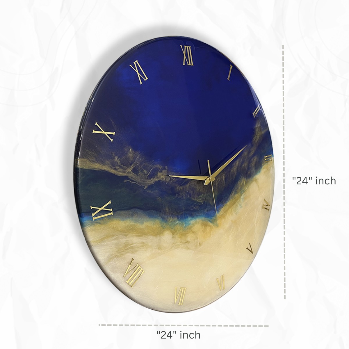 - Color/Pattern: (Circle shape), Royal blue with metallic off-white resin clock with acrylic roman numbers.